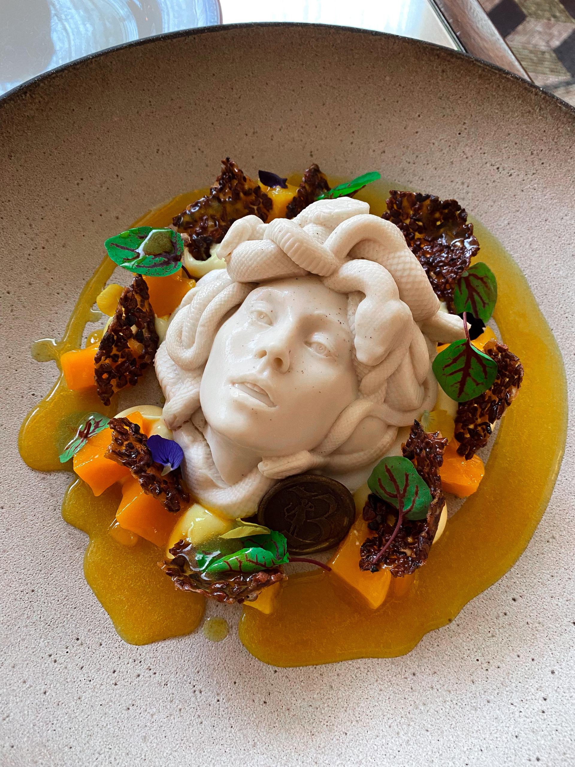Now, dessert features Bacchanalia’s real pièce de résistance: Medusa. Or Coconut Medusa as she is affectionately known in household. Whatever I thought the Medusa was going to be like when I ordered it, Bacchanalia’s final product completely exceeded my expectations. The £50 dessert is a coconut and tonka cream mould of Medusa’s snakey head. Cut inside the soft cream layers and you’ll find exotic fruits aplenty, including mango chunks.